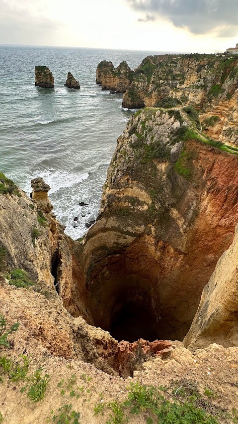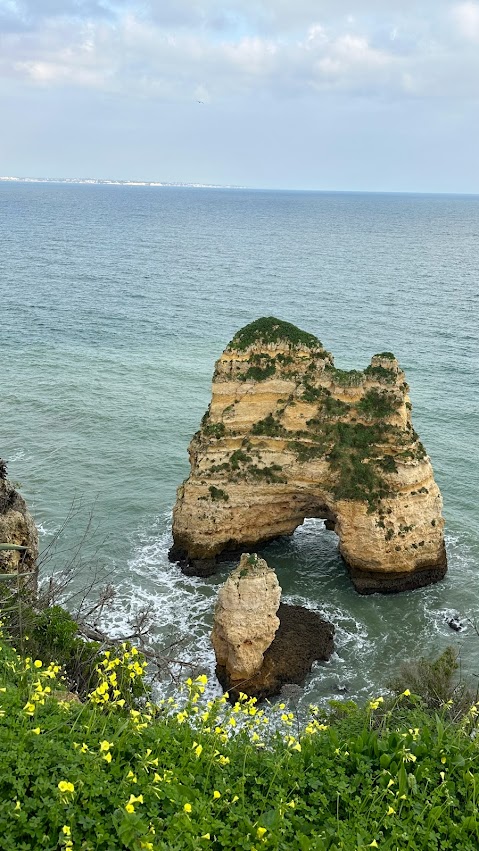 我们从圣维森特角到拉各斯的佩达德角,观赏了Praia do Tonel 海滩,Praia do Camilo卡米洛海滩和Praia Dona Ana 多纳安娜海滩。大部分海滩边修建有人行栈道或者游人们踩出的羊肠小路。这里真是被上帝亲吻过的绝美海岸线,一望无际的大海从深蓝渐变至祖母绿,在阳光的照耀下清澈见底。在海水长期侵蚀和海风的作用下,海岸边的悬崖石块被大自然雕琢成了形态各异的洞穴、拱门和从地面到海平面的深井。海水里的岩礁也栩栩如生,有的看似大小狮子对视,有的形同小狗望月;大自然的神笔还在多纳安娜海滩的石灰岩上雕刻出耶稣的十二门徒像。