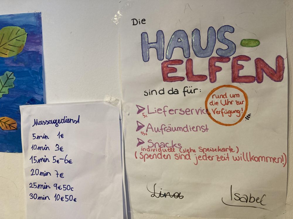 内容倒是随机随意,比如,做一杯咖啡,帮忙收拾一次厨房,又或者,5分钟免费按摩——这已经是优惠价了哦,我们家的Hauselfen不便宜的,我经常收到账单,价目表长这样。