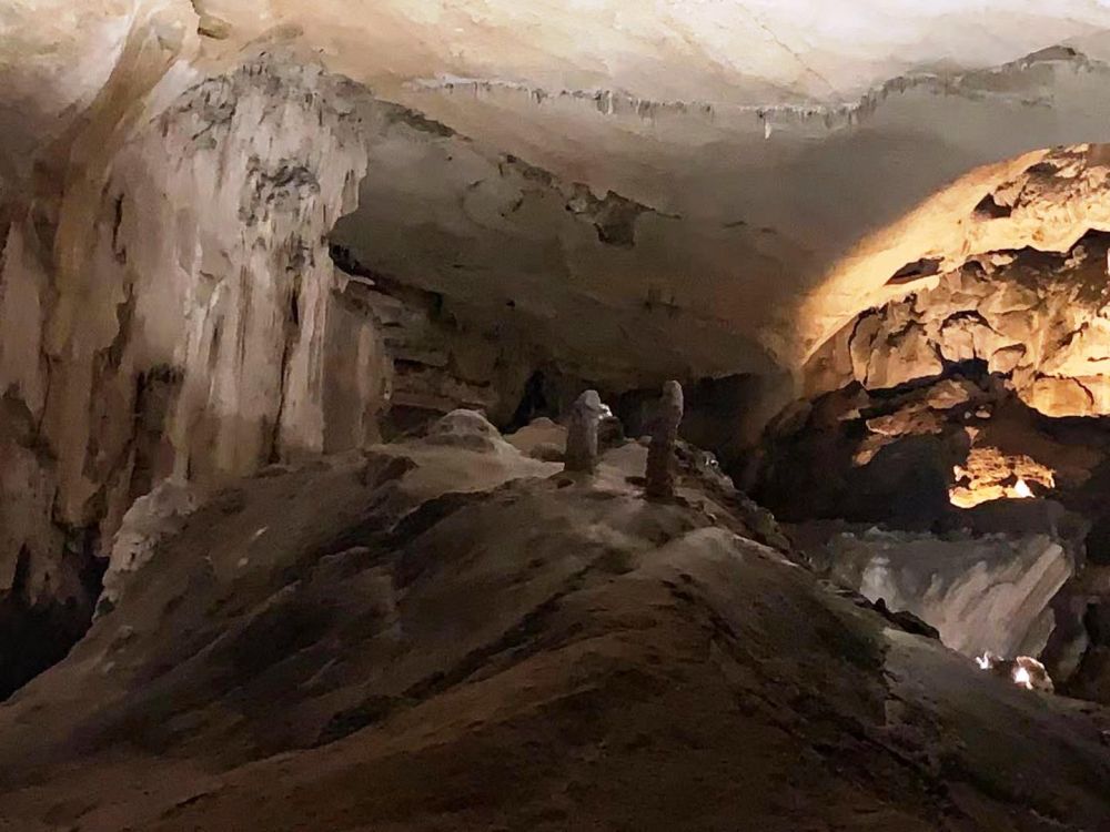 从交汇间沿着逆时针方向往前走,洞壁和头顶上有许多开口,我们便来到了石帷间(Curtain Room)。在这里,流石以帘幕的形式从洞顶垂下,像是有人精心折叠过似的。复行数武,穿过曲折蜿蜒的狭窄通道,我们来到了一个叫做风琴间(Organ Room)的巨大空间。在这个巨大空间中,一整片6米高的巨大流石如瀑布挂在眼前,瀑布底端是悬在空中的一排弯曲双刃的钟乳石条,活像一架巨型管风琴。从这个空间出来,有几个凹室,部分被薄薄的窗岩隔段分开。各个凹室中填有粘土和砾石;这些粘土和砾石在主干道上经常可以看到。类似裂缝的狭窄开口和管状通道从这部分朝不同方向辐射出去,其中一些构成完整回路。坍塌下来的巨型大理石占据了这个空间和前面连接其他空间的大部分地面。