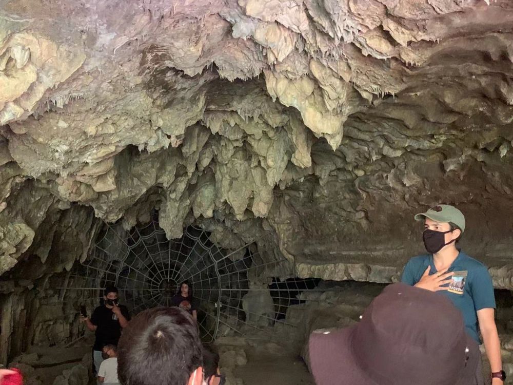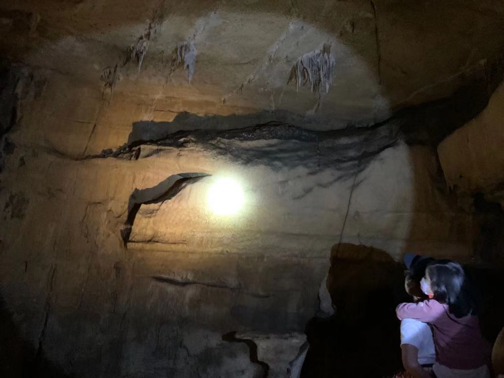 来到水晶石花洞门口,一股清凉的空气扑面而来,精神顿时为之一振,炎热天气给人带来的萎靡倦怠一扫而空。由于新冠疫情的影响,参观石花洞期间,公园要求所有游客必须全程佩戴口罩,将口鼻完全遮盖住,以防止病毒进一步扩散。导游从游客中请了一名志愿者当她的助手,并且给了这名助手提供一只手电筒,令其断后,确保每个游客在参观过程中走在一起,以免有人在洞中走失。