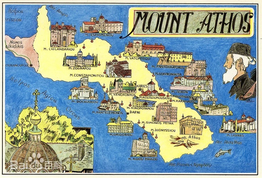 阿索斯山(Athos)位于爱琴海北部的一个半岛上。半岛延伸到爱琴海约60公里,宽度大约是7到12公里,是属于希腊的一部分。阿索斯山的海拔约两千米,山径陡峭,丛林密布,交通极为不便,但阿索斯山里建有二十座大大小小的寺院,这些寺院里,隐居着一千六百多个身穿黑袍,留长发、吃素食的男士,人们称其为修道士,或和尚,人们把阿索斯山称为“圣山”或“修士之国”。
