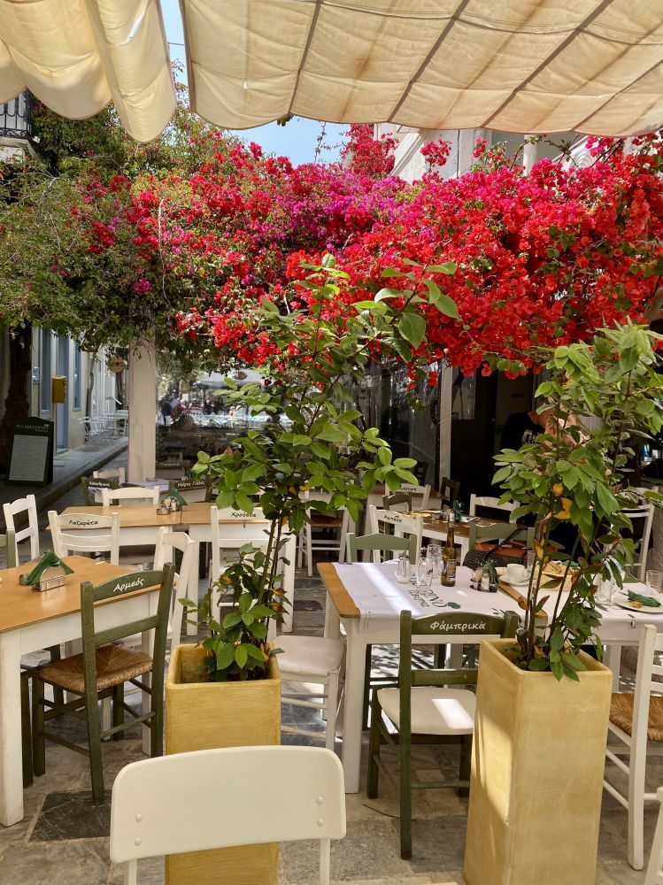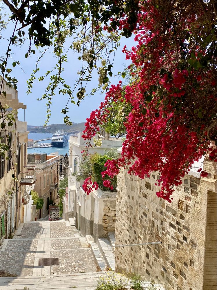 我们在埃尔穆波利市的街道上逛着,时而看见人们在路边的餐桌上悠闲地享用咖啡美食,沿路上,艳丽的三角梅随处可见。沿着通向山上的石头街梯往上走,两边小屋以土黄色为基调,虽旧但不失优雅。街边的小猫似乎也不缺吃的,懒得理睬我们这些游客,随地趴着晒太阳。我们悠闲地围着市中心兜了一圈,逛了两个教堂,高处看到了海景,市政厅广场人不多,沿海边走回到船上时,邮轮上正在准备当天晚上的白衣晚会(White Party)。