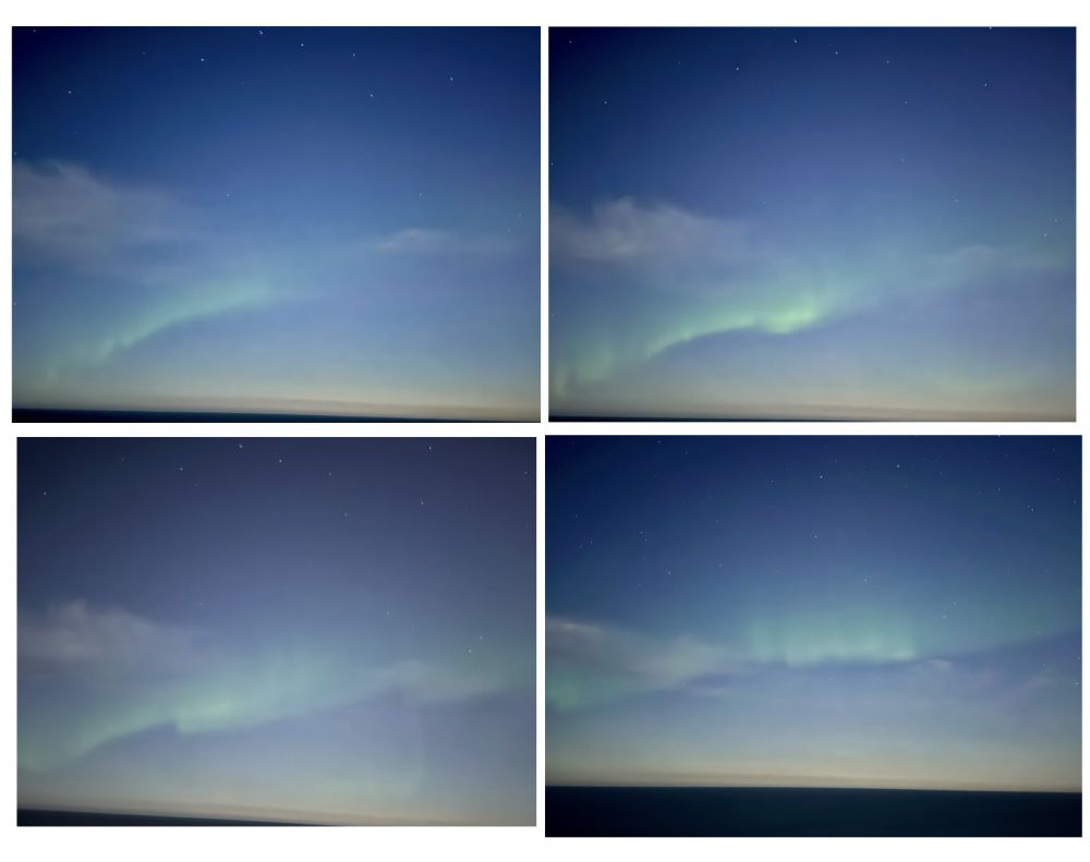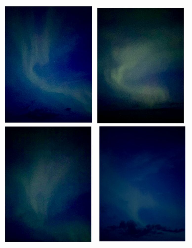 有时侯赶早不赶巧,靠谁都不如靠自己。在邮轮到达 Bodo 的前一天凌晨三点半,我偶然醒了,出去一看还是有云,但能看到几颗星星。肉眼看不出什么,用手机拍照,看到是有绿色,心想这可能就是极光,但也不能确定,所以,拍了几张就回去睡回笼觉了,反正天也快亮了。第二天早上,我拿着照片去请教有经验的船友,没想到,除了我以外还有其他人也拍到了类似的照片。有些人不认为我们看到的是极光。我们也觉得,这次看到的既使是极光,效果也不太明显。但多数人认为这就是极光。