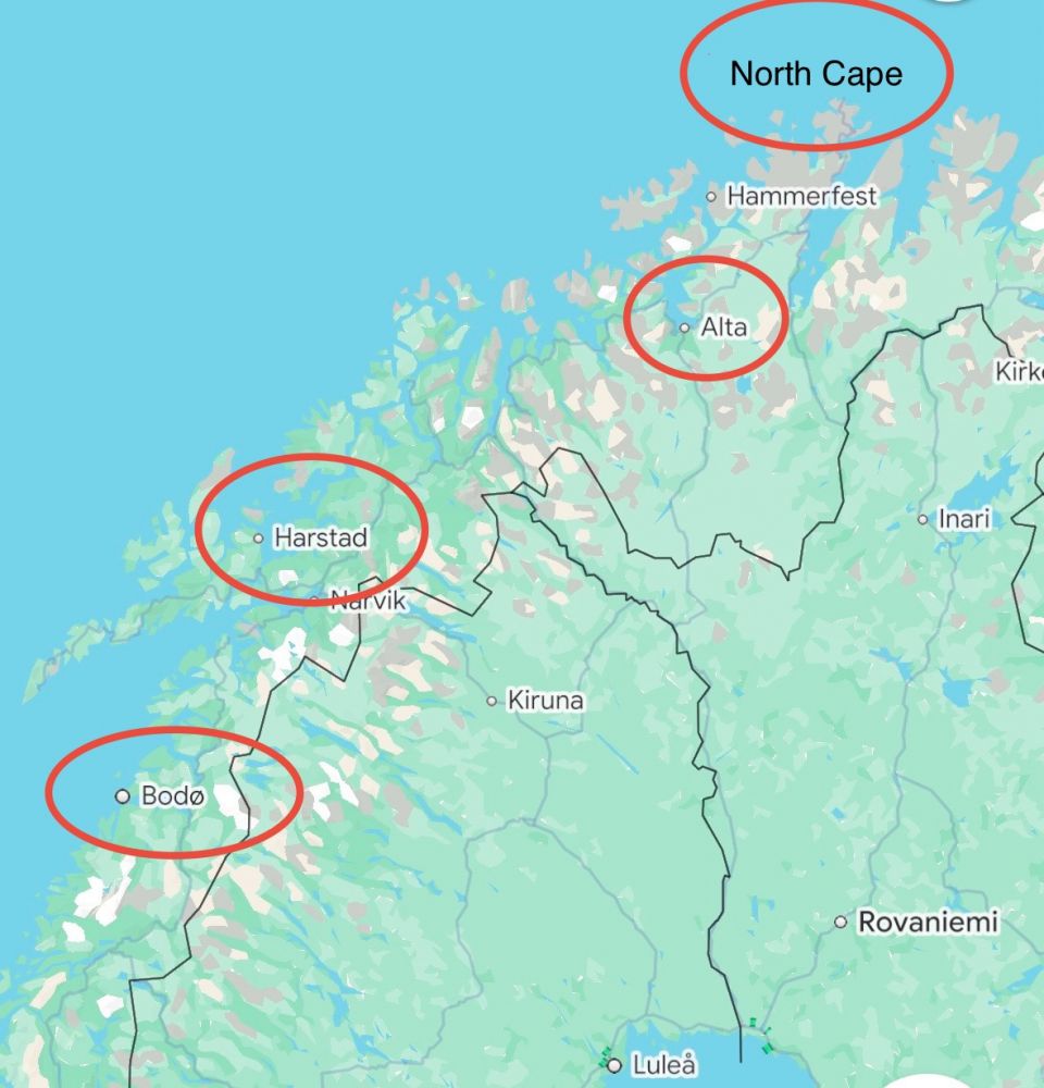 能否看到极光,很大程度上还取决于天气情况。我们从冰岛的雷克雅未克出发开始,一直到邮轮进入北极圈(Arctic circle)的近三个星期里,每天晚上云层密布,根本就没看见极光的机会。到达地球最北的斯瓦而巴群岛后,又是极昼,整天没有黑夜,即使天上有北极光也是看不到的。邮轮向南航行朝挪威方向开出北极圈,一天之后就驶出极昼地区,开始看到黑夜了,但夜里看不到星星,也没看到极光。邮轮到达挪威(Norway)本土, 停靠了最北端的港口 Honningsvåg, 接下来又到达了最容易看到极光的 Alta 和 Harstad 两个港口,只不过运气不好,每天白天都是晴天,到了夜里就是云层密布。每天夜里盼星星盼月亮,盼来只是寂寞。 因为再过两天就要开出北极圈,快看不到极光了,邮轮上的一些乘客开始极紧张起来,有的去请教随船办天文讲座的讲师,有的就直接找船长,问他们在今后的两天夜里能否看得到极光。但无论是谁,极光是很难预测的。邮轮的客服部门答应,如果船长驾驶室看到极光,一定通知到有需要看极光的乘客。
