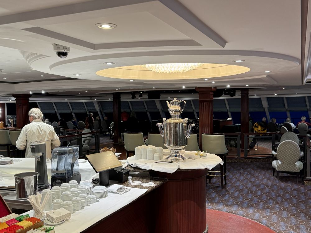 邮轮上有一些早起占座位看峡湾的人,邮轮上为他们备好了简单的早点