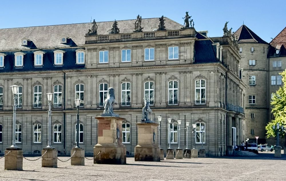 新王宫建于18世纪,是一座巴洛克风格的宫殿,它是德国南部最大的城市宫殿之一。当时的一位法国主建筑师曾按照凡尔赛的结构建造这个王宫,不过未能完成。这座王宫在二战时期几乎被摧毁,后得以修复重建。