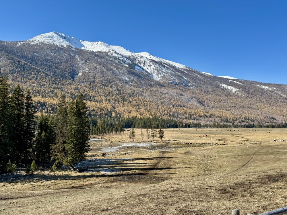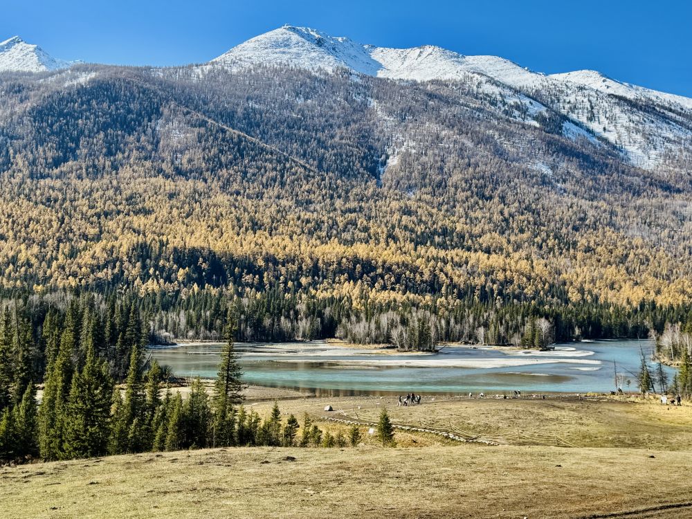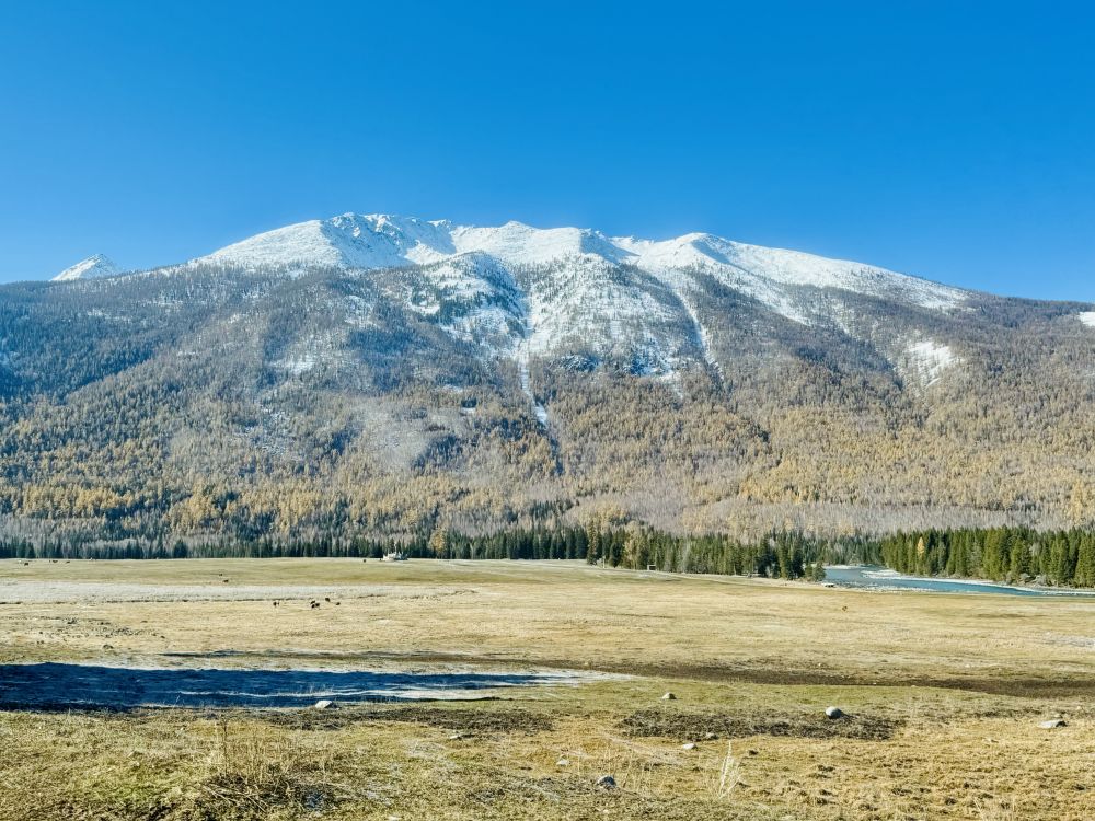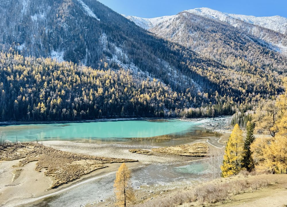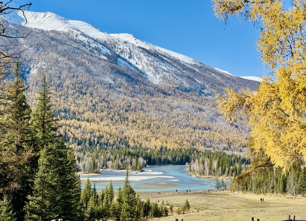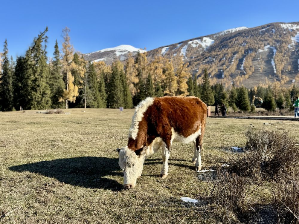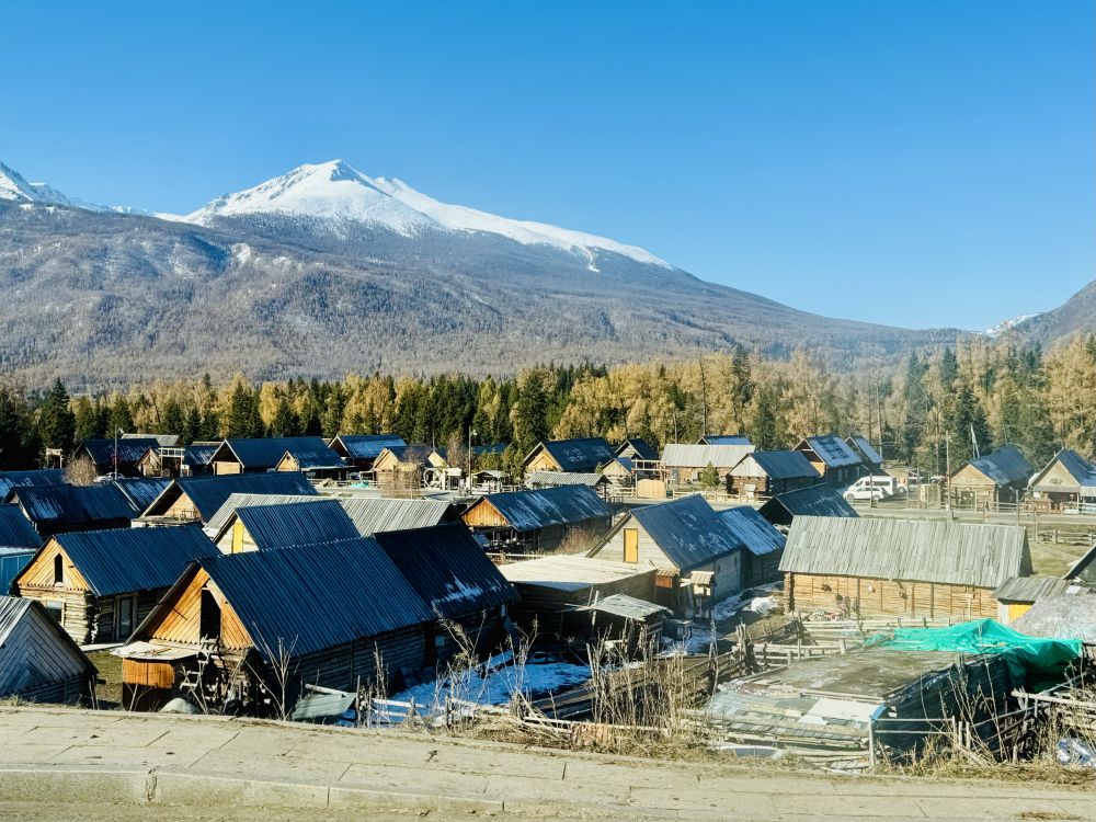 我们原计划是要在喀纳斯住上一两个晚上,因为附近还有禾木和白巴哈村另外两个景区,这两个景区都可以搭景区班车进去。但直到最后,我们才发现喀纳斯景区的班车是完全停运了,所以,我们只好放弃去禾木和白巴哈村的计划,让司机开车带我们在景区走,结束后带我们回布尔津,这样我们可以早点去北屯赶火车回乌鲁木齐。我们从司机那里得知,禾木的树林已经变成光秃秃的一片片树干了,白巴哈村的情况也差不多,没什么好看的了,不建议我们去。问起新疆北部的其它几个景区的情况时,司机说可可托海是个景点,主要是因为走红一时的《可可托海的牧羊人》那首歌,但可可托海的草原因天冷已经变黄了。我们又问了歌中提到的伊犁和那拉提草原,司机说那拉提草原现在也不是最美的季节了,不过伊犁的赛里木湖受季节的影响比较小。赛里木湖和那拉提草原都在我们新疆的计划里。
