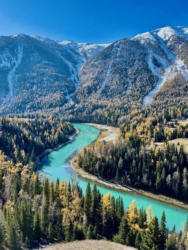 国内的十一黄金周过后,新疆的旅游进入淡季,从10月15号开始,喀纳斯景区进入冬季运营模式,景区的很多服务设施和游乐项目都取消了,我们一开始也觉得没必要去。但从天气预报上看,十月底的喀纳斯还没有完全凉下来,白天温度在摄氏个位数字,从景区官网的实时视频上看,红枫彩叶的成色似乎已经接近尾声,但阳光照耀下的月亮湾景色还真是挺美的,所以我们决定还是去喀纳斯看看。