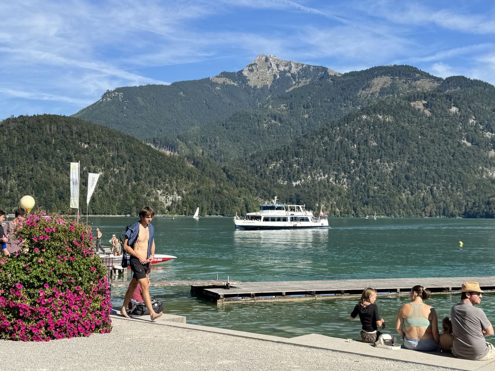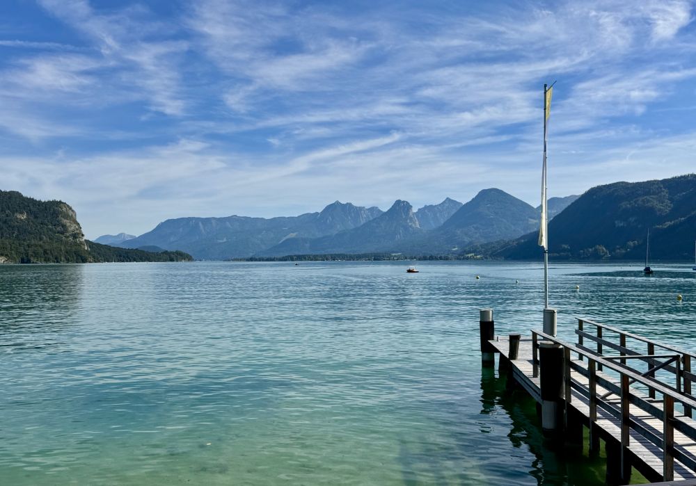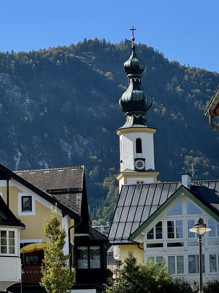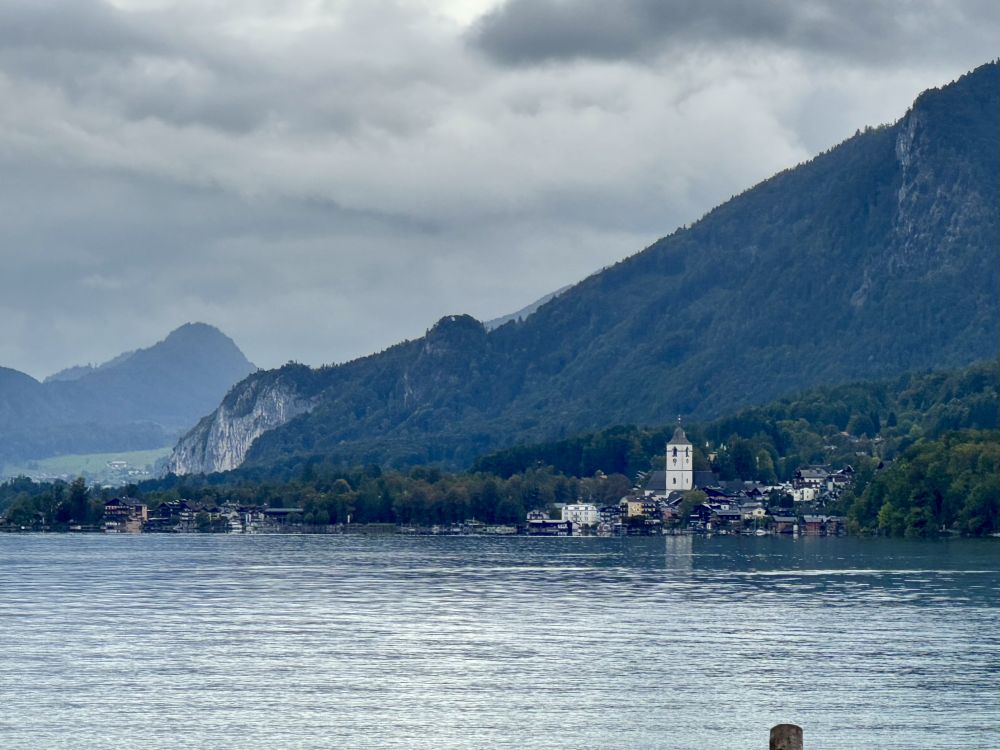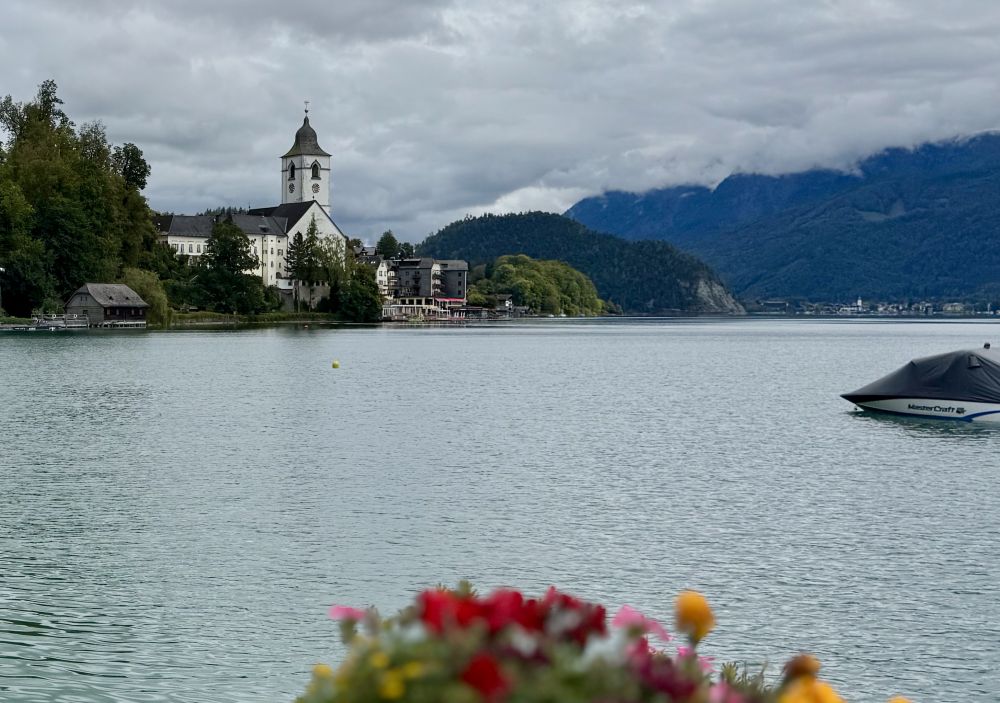 上次来奥地利的沃弗冈湖(Wolfgangsee)还是在25年前2000年,那时我们也是开车了先到了奥地利的萨尔茨堡,然后在行程中找到了一个机会来到了一个叫圣吉尔根(St Gilgen)的小镇,这个小镇就坐落在沃弗冈湖边。圣吉尔根位于萨尔茨堡以东大约三十公里,小镇看上去和其它奥地利小镇一样,有一个楼顶高耸的小教堂,老远都能看见,小镇上一个个色彩各异的小房子窗外阳台上装饰着各式各样的花草。镇上行政厅的门前,建有一座塑像,上面是奥地利天才音乐家莫扎特在拉小提琴。这个小镇之所以特别,是因为莫扎特的母亲出生在这个小镇,莫扎特的姐姐也曾住在圣吉尔根。因为莫扎特的关系,这座小镇有时也被称为“莫扎特村”。可以看出,奥地利人为能产生出莫扎特这样的天才而有多么自豪。