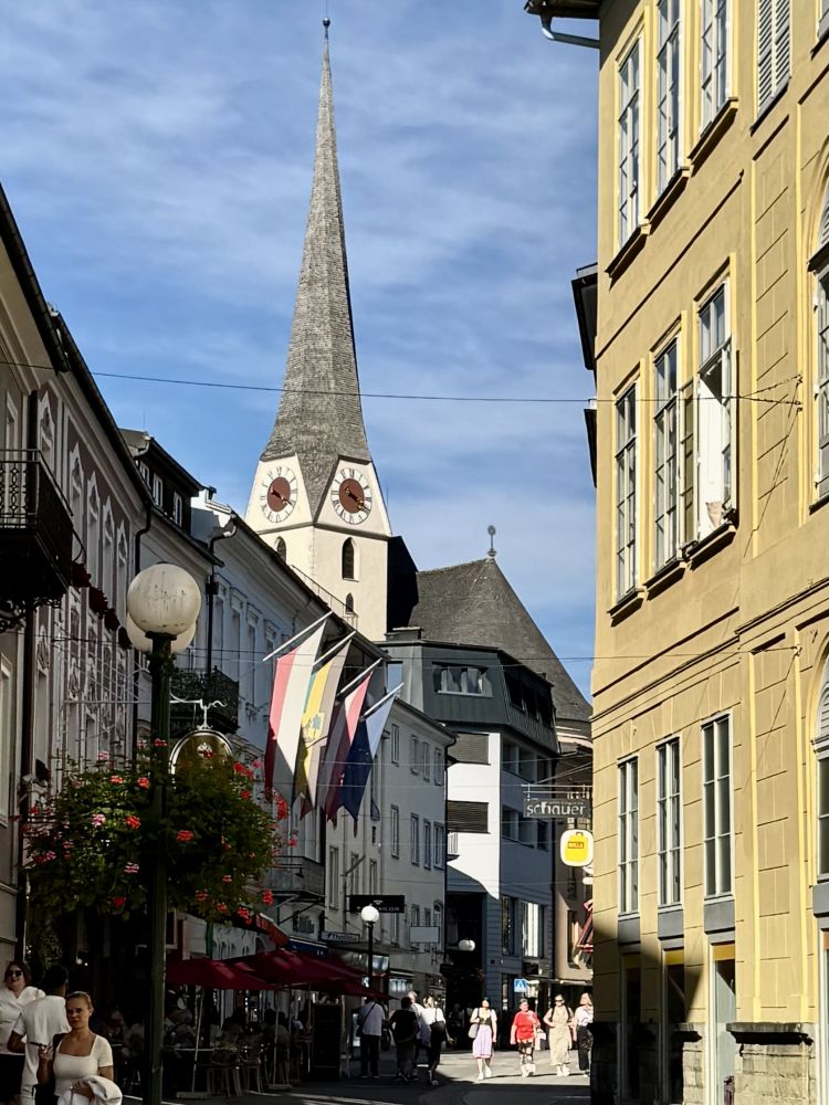 较为惬意的是,我们拿着刚买的冰激凌,边走边吃,找到湖边的一条长凳上坐下,一边吃着甜的,一边享受着湖光山色。也许因为是周末,来湖边游玩的人不少。有些人来到湖边晒太阳,有些人在湖上玩船,也有些人在水里游泳。远处忽见一个老太太全身一丝不挂地从水里起来,就地裸坐在一旁晒太阳。老太太似乎不在乎周围游人的目光,一切看上去很自然,也许奥地利的文化就是这样的。其实后来在酒店蒸桑拿的时候才发现,奥地利的桑拿浴不仅是男女共用,而且都是男女一丝不挂地坐在同一个房间里蒸桑拿,完全没有什么不好意思的。