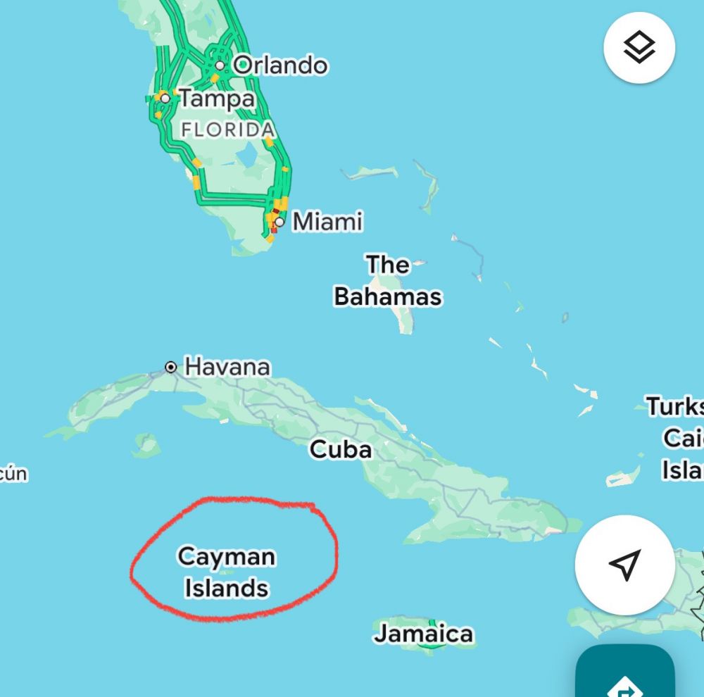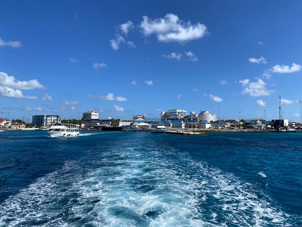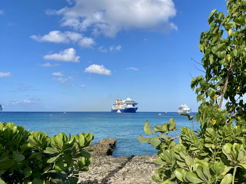 我们的邮轮从美国佛罗里达州的Fort Lauderdale港口起航后,沿佛罗里达海岸向西南方向航行,接近古巴岛时,沿古巴海岸逆时针绕行,最后抵达位于古巴南边的开曼群岛,大开曼岛位于群岛的西部。虽然大开曼岛上建有邮轮码头,但我们乘坐的这艘13万吨级的大船无法靠岸,只能抛锚停在大开曼岛西边的港湾内,通过摆渡船来把我们送到岸上码头。