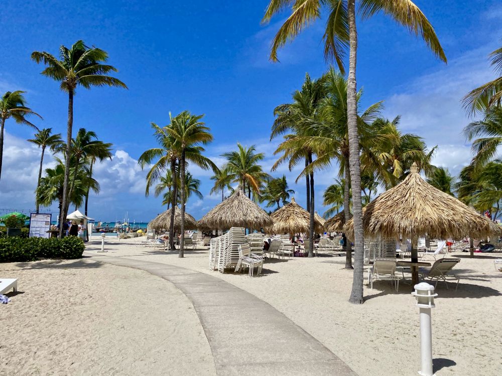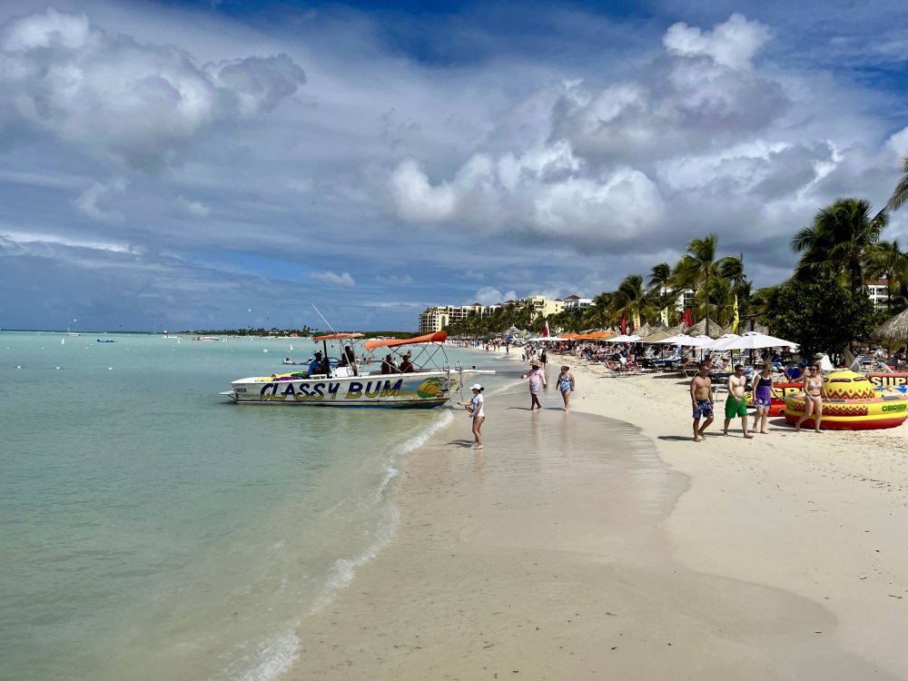 阿鲁巴岛地处加勒比海飓风带之外,以其迷人的洁白细腻的沙滩、阳光明媚的气候以及充满活力的文化而闻名,享有“One happy island”(快乐之岛)的美誉。岛上最美丽的海滩位于岛的 西北部,最著名的有Palm Beach 和Eagle beach 两个海滩,这里集中了包括万豪,希尔顿,凯悦(Hyatt)等众多的大型的国际品牌酒店, 其中万豪(Marriott)的规模最大,旗下的豪华品牌Ritz-Carlton和St Regis,以及高档品牌Vacation Club的两个度假酒店都建在海滩边上。人们在这里尽情享受着加勒比阳光,还有浮潜、帆板和徒步等活动。