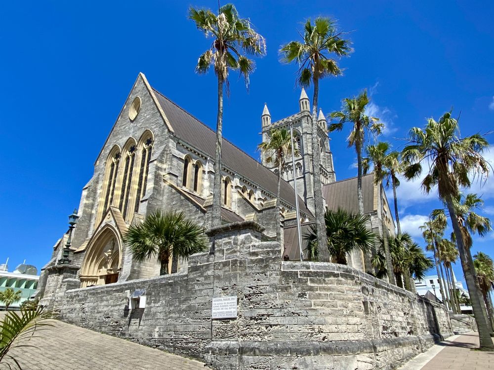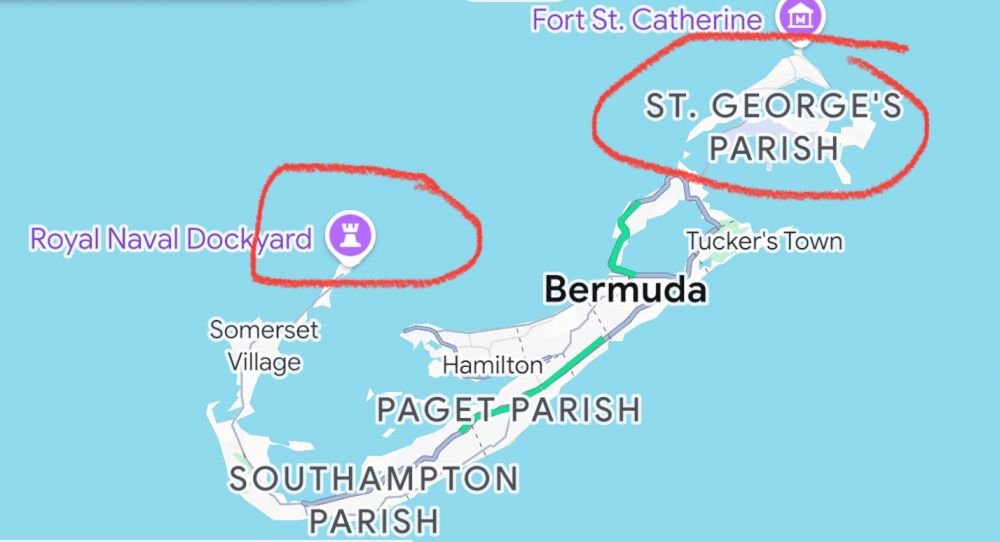 百慕大岛看上去像一个鱼钩儿,位于鱼钩的钩尖的处是皇家海军码头(Royal Naval Dockyard),位于鱼钩柄的柄头位置是圣乔治(St. George),这是百慕大的一个中心地区,岛上的大多数居民都居住在圣乔治地区,机场也建在这个区域。圣乔治建有一座古老的城堡,圣彼德教堂(St Peter)是圣乔治的一座最古老的教堂。