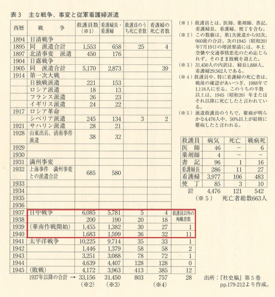 [15] 表引自山田ノリ子『日中戦争から第二次世界大戦下の従軍看護婦 -日本赤十