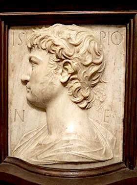 下面是 Scipio Africanus 的雕塑。他是统领第二次布匿战争的罗马将军。第二次布匿战争是三次布匿战争中规模最大的一次。Scipio Africanus 是小西庇阿将军的祖父。也被称为 老西庇阿将军。其实 Scipio Africanus 打第二次布匿战争时才 33 岁。