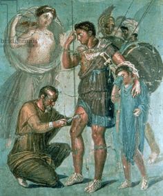 下面是多年后发掘出庞贝古城的壁画(庞贝被火山爆发给埋了,千年以后才发掘出来):父亲 Archises 安喀赛斯在给Aeneas 阿涅阿斯处理伤口,孙子 Lulus (Ascanius) 在哭,阿涅阿斯的母亲 Venus 维纳斯 在一旁关注。维吉尔的诗写得跌宕起伏,十分有气势,又很精美。有作者说关于特洛伊木马的故事其实是维吉尔讲的。