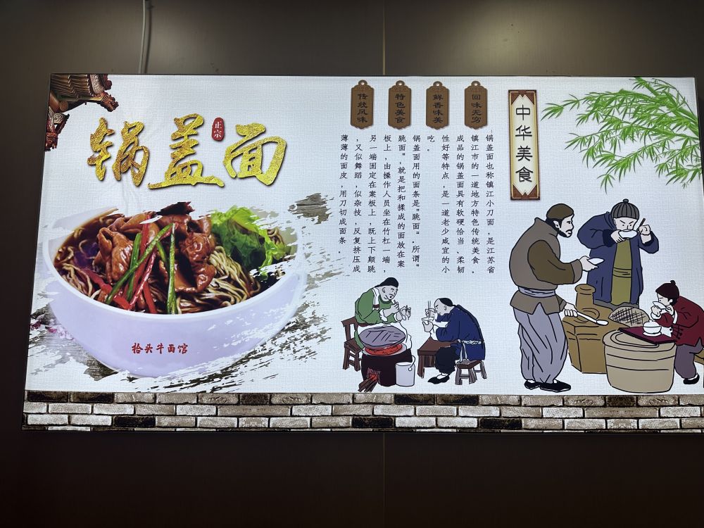 面锅里面煮锅盖是指镇江的特色美食锅盖面,镇江大街小巷都有锅盖面店。我不想在外地人扎堆的西津渡古街区里吃,想找一个当地人吃面的地方。我在距西津渡不远的居民区找了一家锅盖面店,推门进去,一个客人也没有。正想扭头出门,突然看见墙上贴着介绍锅盖面的历史和制法,就改变了主意,找了个坐位坐下了。 我看了一下手机,刚刚下午四点,难怪没有客人。