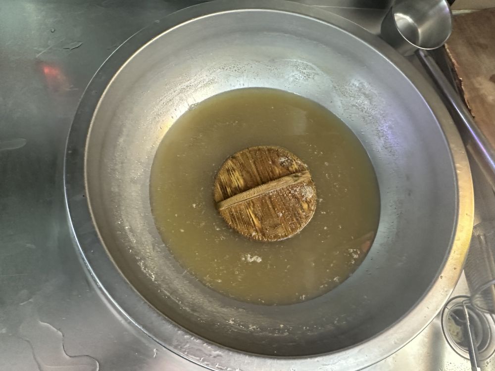 煮面的大锅就在门口处,从外面透进窗户可以看到。服务员打开大锅盖,看到锅里的水上漂着一个木锅盖,我问道锅盖是什么木的,回答道是榉木。煮面时面条在下,榉木盖在面条上一起煮。看来锅盖面的名字就是这么来的。 煮面的汤就作为面条汤,加上本店特制的老汤(猪肉,鸡肉煮的)和酱油。客人要什么面,就放什么浇头。如排骨面,汤中放上排骨。百面百浇头,浇头可千变万化,做面的程序都不变。