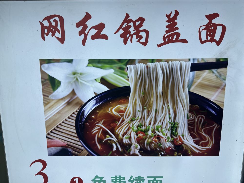 趁着做面的空闲,看了墙上的锅盖面的介绍。锅盖面的做法源于清朝,据说康????下江南时,到了张嫂子面店。张嫂子忙中出错,误将汤罐上的木盖当成锅盖放进了煮面条的大锅里。 煮出来的面条却很可口,还被乾隆皇帝夸赞。虽然锅盖面的做法在清朝乾隆年间已经出现,但锅盖面的叫法只有30多年。