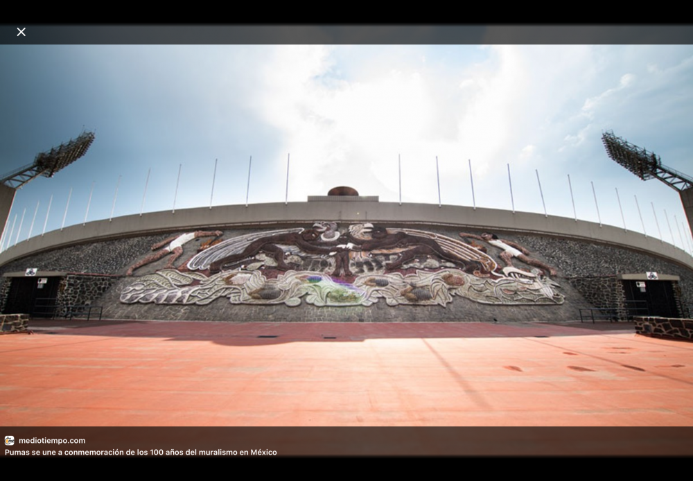 "三杰"中最著名壁画大师迭哥·里维拉创作了墨国大奥林匹克体育场外部的壁画,这个《大学、家庭与体育》壁画是墨西哥二十世纪壁画运动的重要代表作之一,它融合了建筑,艺术与民族文化,设计灵感源自火山口的造型,并与当地的熔岩地貌相呼应,材料选用了火山石。其意义是教育、家庭和体育构成理想的社会,体现了墨西哥革命后对民族的认同和对社会意义的思考。