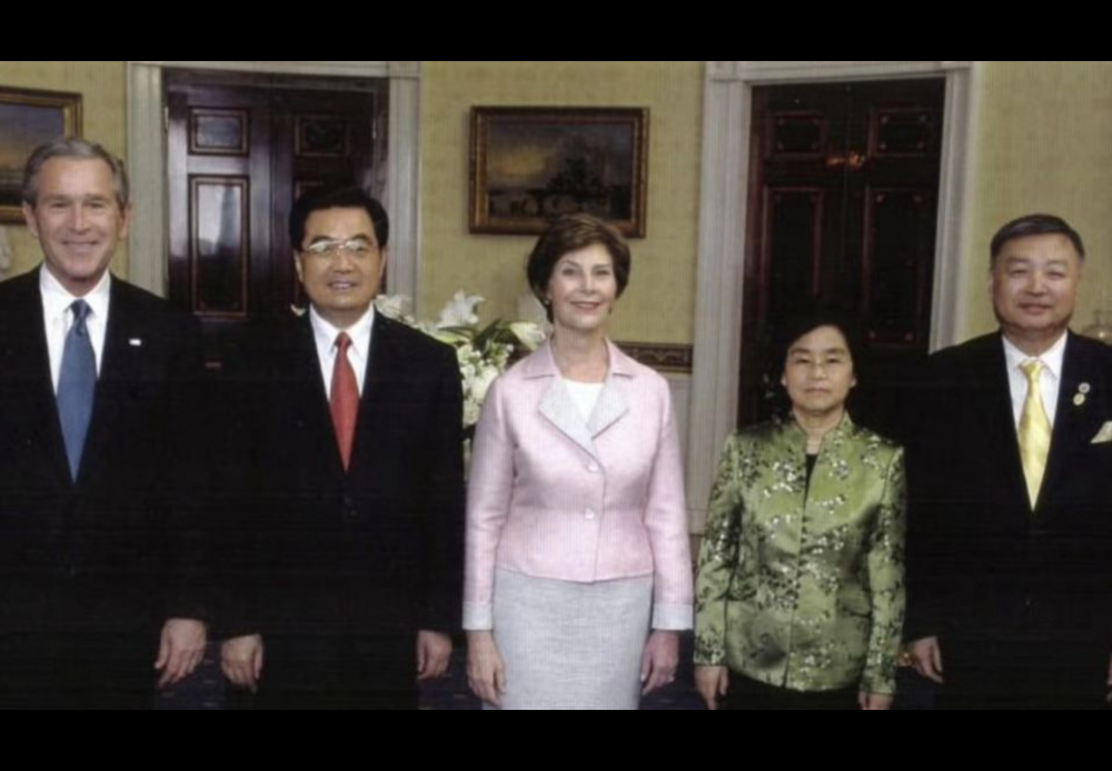 王先生陪同布什总统夫妇与胡锦涛主席夫妇见面。