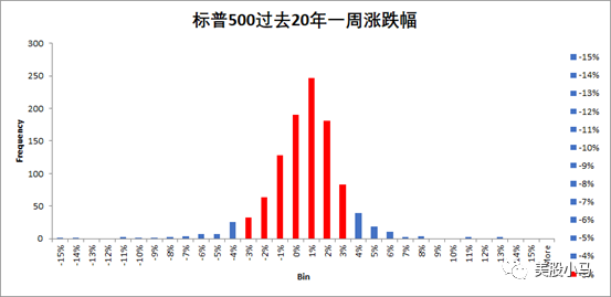 不知道结果会不会让小伙伴们大吃一惊。一周跌过3%的情况是8%。一周涨过3%的情况是15%,而一周是平的情况是是76%! 上图中那些标红的柱子范围。也就是说,大部分时间,标普一周的涨跌在-3%到3%之间波动。