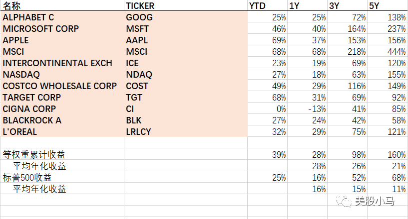 为了便于比较,我这里将这种投资方法定义为“等权重美国核心资产指数”,将将11家股票每月收益算数平均,便得到了美国核心资产指数每月收益。