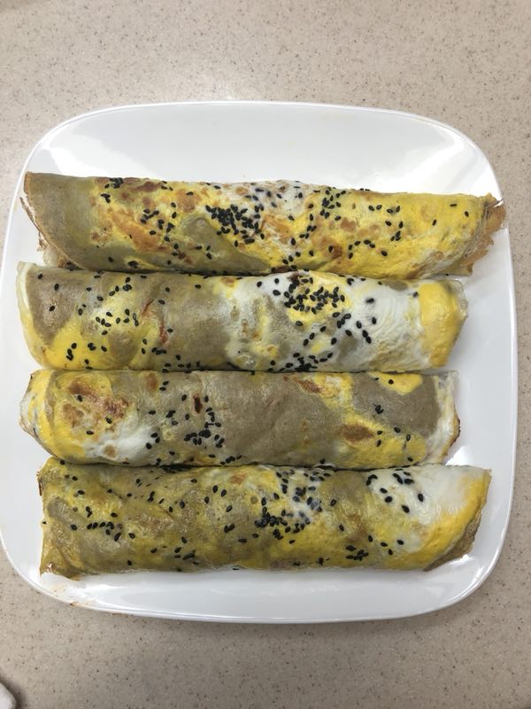 在国内生活时,每天的早点首选是煎饼果子。果子其实就是油条,这是只有天津人对油条才有的称呼。记得当年学校门口有个小摊儿,那对夫妇每天清早都“掐”着时间点儿,早早地“恭候”着老师和学生们的到来。他们将摊儿车整得很干净,车上有橱窗,防风保温。女的收钱,男的操作。车正当中摆着一块圆形铁铛,被下面旺盛的炉火烧得滚烫。四周摆着各式调料工具,现吃现做,立等可取。师傅先用油擦儿在铁板式的平锅上刷薄薄的一层油,浇上一勺提前调好的面糊,然后抄起一个小推子,轻轻转一个圈,一张薄如绵纸的煎饼便呈现了出来。再看他一只手拿着小推子,另一只手抓起鸡蛋来,一磕一掰,推子跟着一转,之前的薄饼立即披上了一层金缕衣。随后撒上细碎的绿葱花,这时煎饼已经冒起了热气,再换一柄小铲儿,松动一下四下的边缘,用手给煎饼快速地翻个身,中间放上油条或者果篦儿裹上,用小刷子抹上甜面酱和酱豆腐,在这个环节中,几乎每一位都会被问上一声“要不要辣子?”,紧接着一翻一折,煎饼装了袋儿交到你手里,全过程不超过两三分钟。