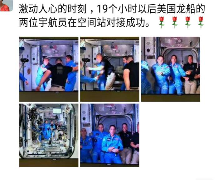 还有朋友在美国龙船的两位宇航员在空间站对接成功后,转发这一激动人心的时刻。。。