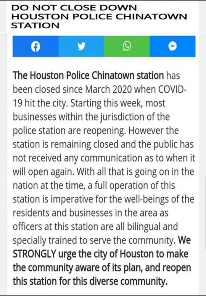 休城的六月正是暑热盛夏,室外骄阳似火,炙热烤人,然而一条消息的传来更让人们心焦气躁:由于经费短缺等原因,休斯顿中国城的警察局在疫情关闭一段时间的重启后很快就要长期close了。