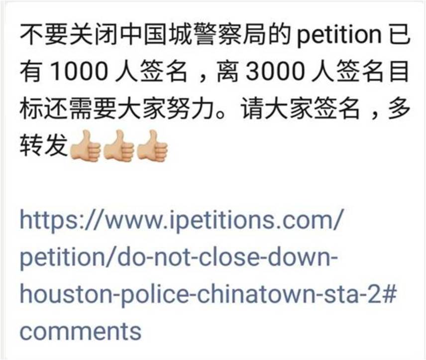 中国城的警察局既尽力维护华人社区的利益,同时也承载了休城华人的众多支持。当它即将长期关闭的消息传来之际,正值美国多座城市和地区发生严重打砸抢事件,乱象丛生之时,这更让这里的华人多增了一份焦急和忧虑。于是,一份请求中国城警察局不要关门的请愿书快速在休城华人中传递。短短一周内就有3,000多人签字,有1,000多人在请愿书上签名后,还写下了情真意切的 comments 。
