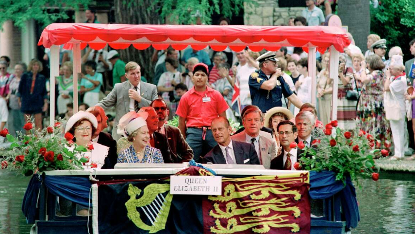 女王乘坐游船沿圣 . 安东尼奥河穿越市中心 。