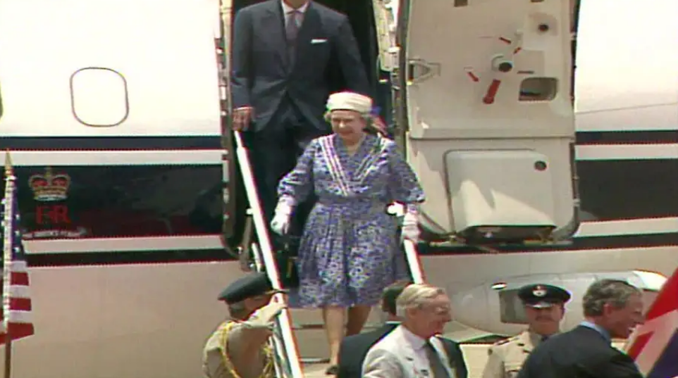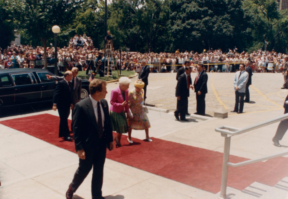 在当时的女州长 Dorothy Ann Richards 陪同下,女王走上红地毯。