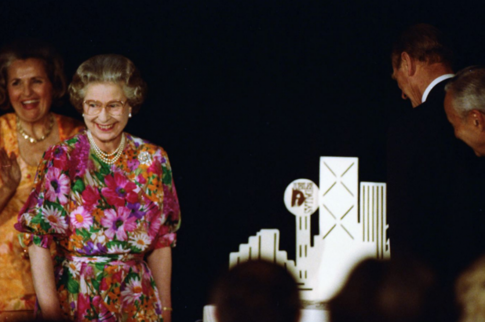 女王抵达位于 Fair Park 的大厅内,参加达拉斯建城150周年的纪念活动。