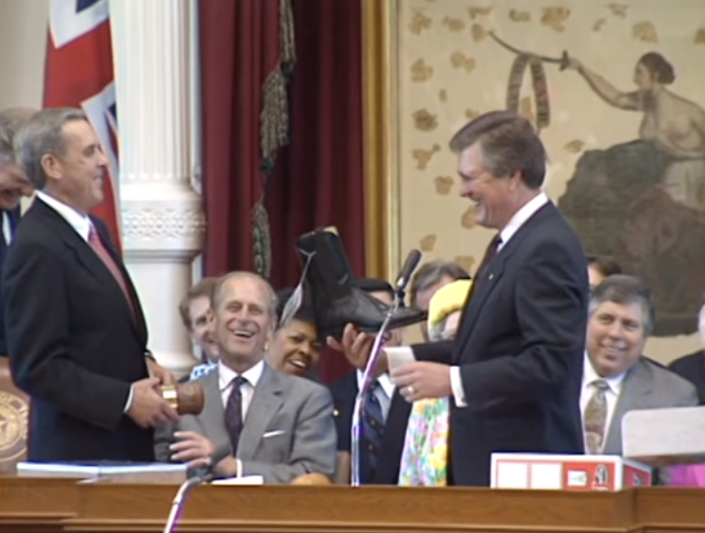 女王参观德州议会大厦,与德州的立法机构进行了交流,东道主送了数双牛仔靴给女王的孙子孙女们。