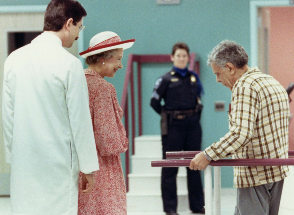 女王到访休斯顿退伍军人医疗中心,与正在接受治疗的退伍军人亲切交谈。
