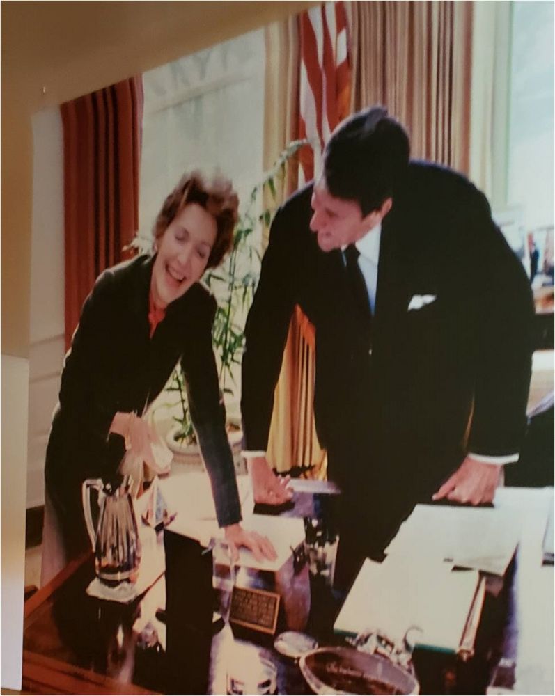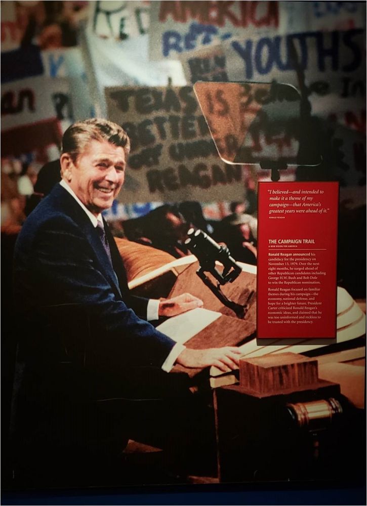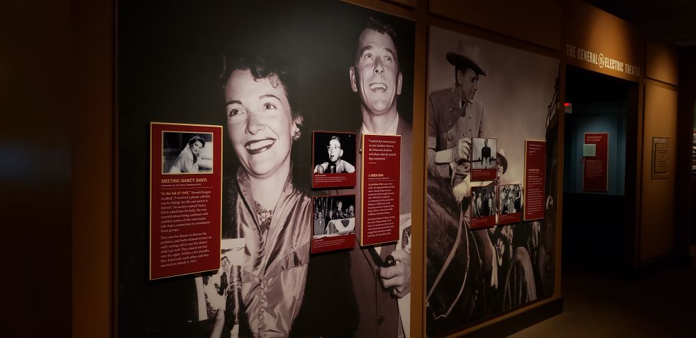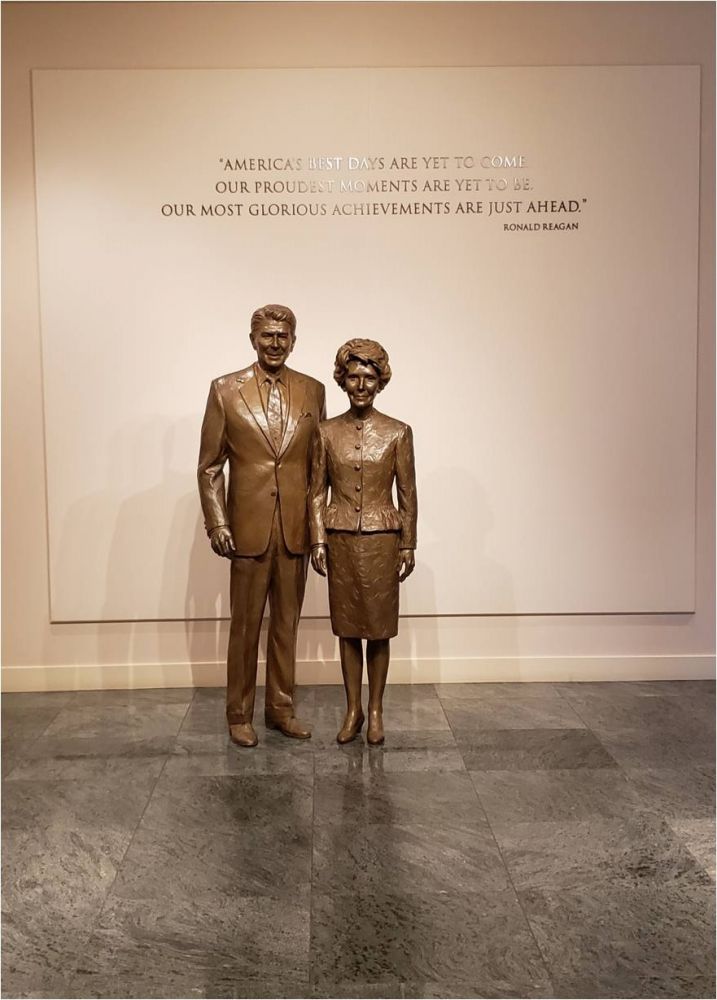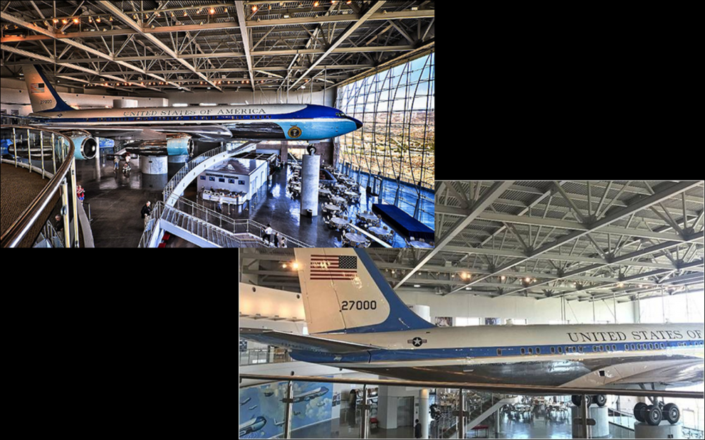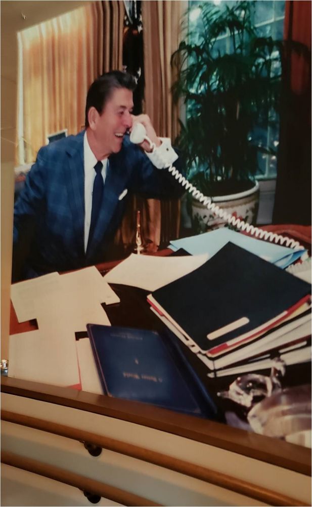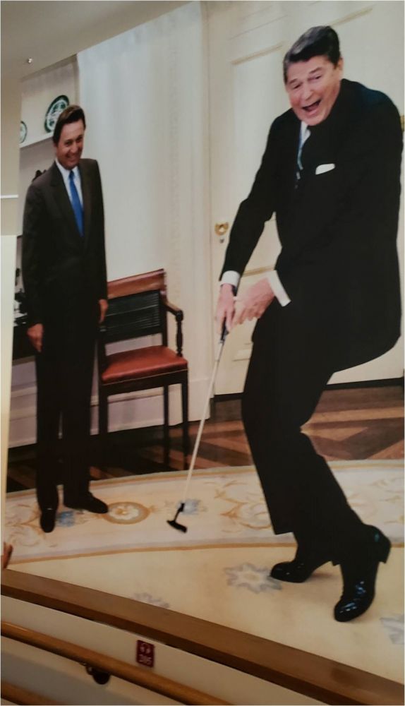 由于手机没电,又将充电宝放在了车上,因此在里根博物馆内漏拍了不少珍贵的照片。留下印象最深,也是不同于其它总统博馆的地方主要有两处:一是馆内循环播放的用最新电子手段制作里根总统的一段视频。真人比例,本人声音,完全是一个“活”着的总统站在到访者面前在那里谈笑风生。。。二是“空军一号”的展出,这架用波音707客机改装的总统专机,从尼克松开始,先后为7位美国总统服务,如今它陈列在专门为其修建的巨大玻璃展厅内。游客可以从机头部登机进入机舱参观,里面的驾驶舱、总统的流动办公室、陪同官员与记者的座舱等,就连专机厨房也可细看个究竟。。。