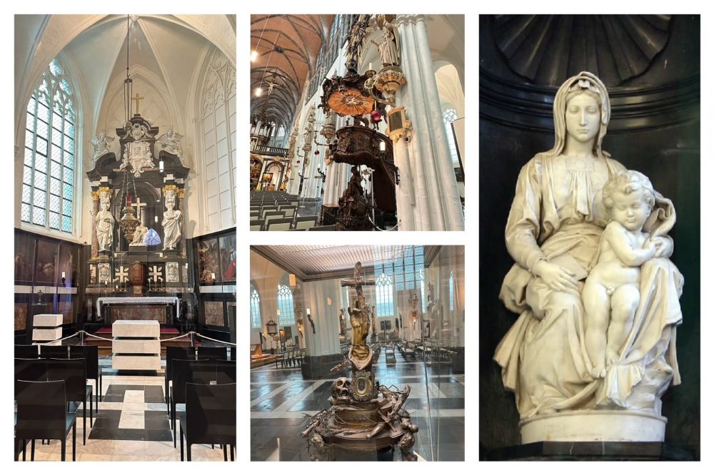 城堡广场就在市集广场旁边,我们找到了著名的圣血圣殿教堂(Basiliek van het Heilig Bloed)。教堂不大,很容易错过,但外墙上有八尊金色雕像,熠熠生辉。