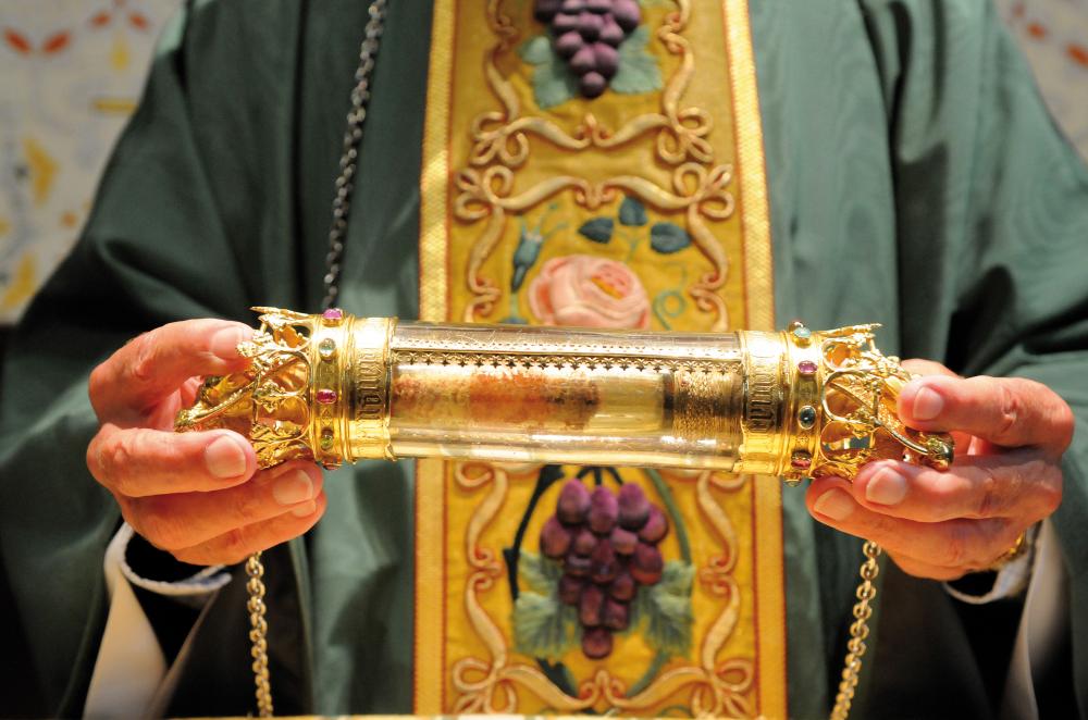 这里之所以有名,是因为供奉着一件宝物 – 装有耶稣圣血的水晶瓶。相传这是1146年佛兰德伯爵蒂埃里一世(Thierry of Alsace)在1149年参加第二次十字军东征后从耶路撒冷带来的,自此一直就保存在这座教堂的上层小堂中。因为这件圣物,这座教堂被梵蒂冈封为“宗座乙级圣殿”(Minor Basilica),仅次于主教座堂。