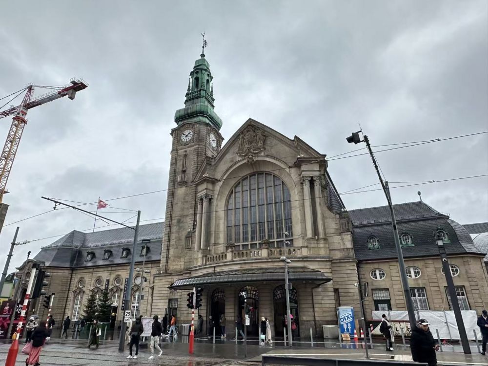 走出车站,迎面是典型的欧洲小城景象:石板路在雨中泛着幽光,电车静静滑过街面,灰色的屋顶在雾气中若隐若现。