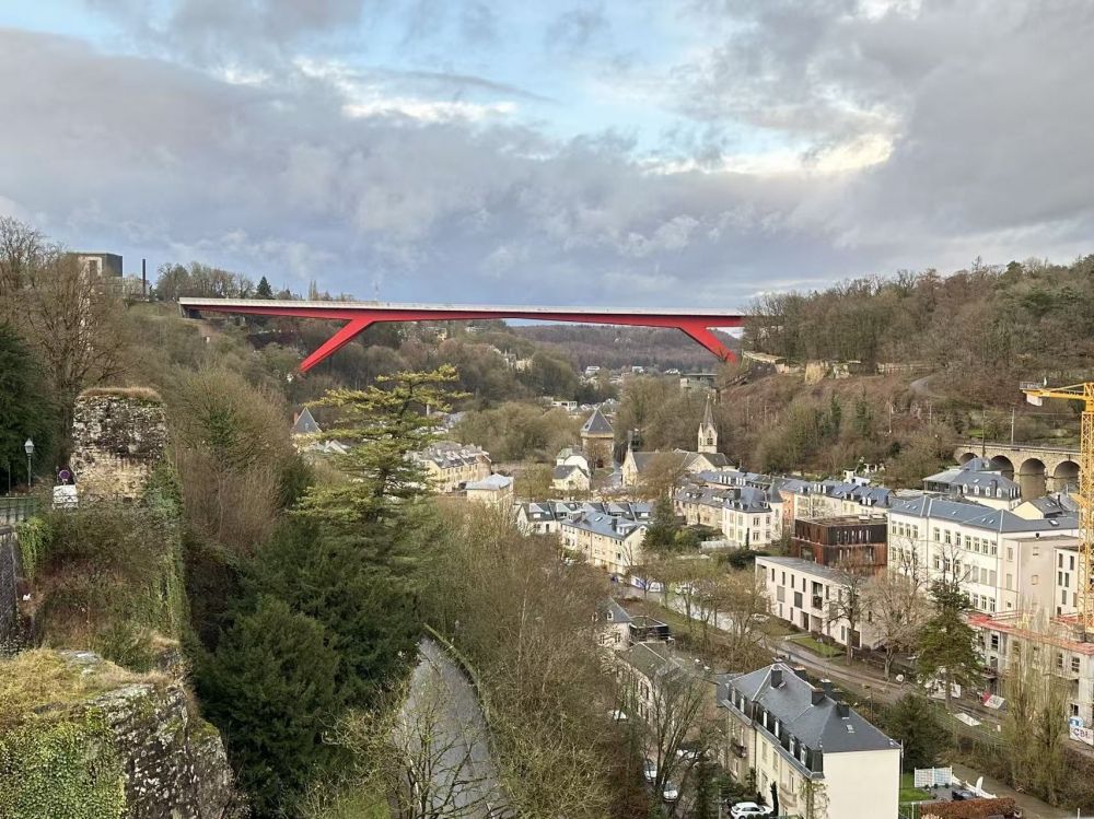大峡谷上空有一座跨越天堑的红色桥梁 -- 夏洛特女大公桥(Grand Duchess Charlotte Bridge)。桥长355米、宽25米、高85米,采用红色钢铁桁架结构,造型轻盈、线条流畅,因形似彩虹又得名“彩虹桥”。