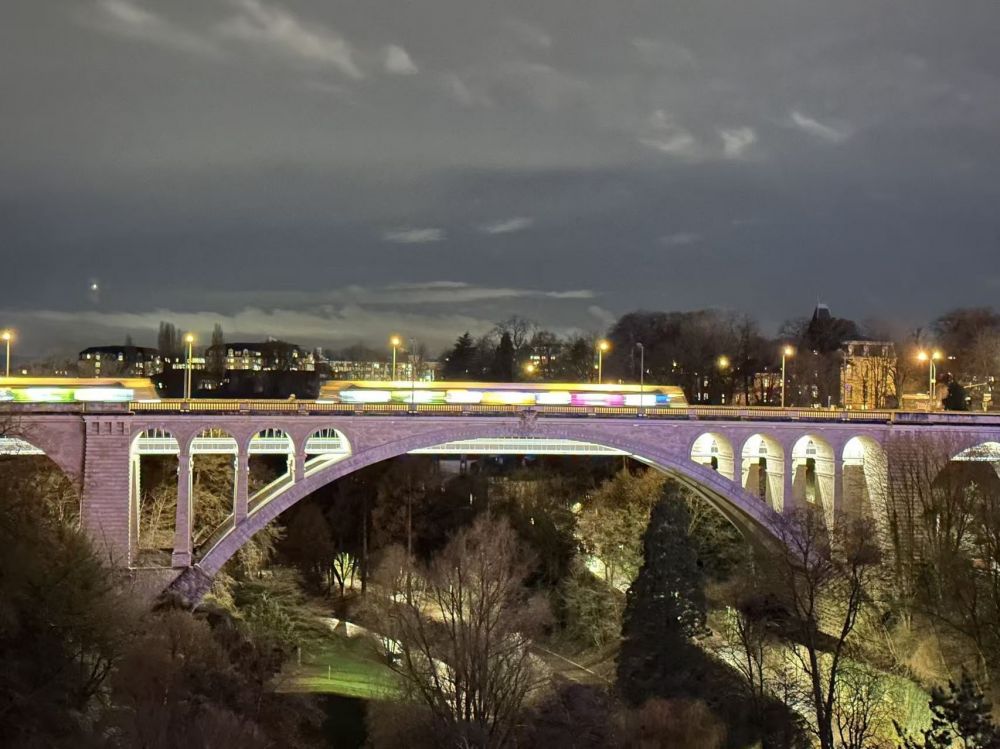 冬天的卢森堡,夜幕早早降临,远处熠熠生辉的是横跨峡谷、古典稳重的阿道夫桥(Pont Adolphe),桥长84米、拱高46米,桥面宽17.2米,这座1903年建成的石砌高架桥,是当时世界上跨度最大的石拱桥,不仅连接着老城与新城,更以其壮观的拱门对称结构成为卢森堡市的地标之一。