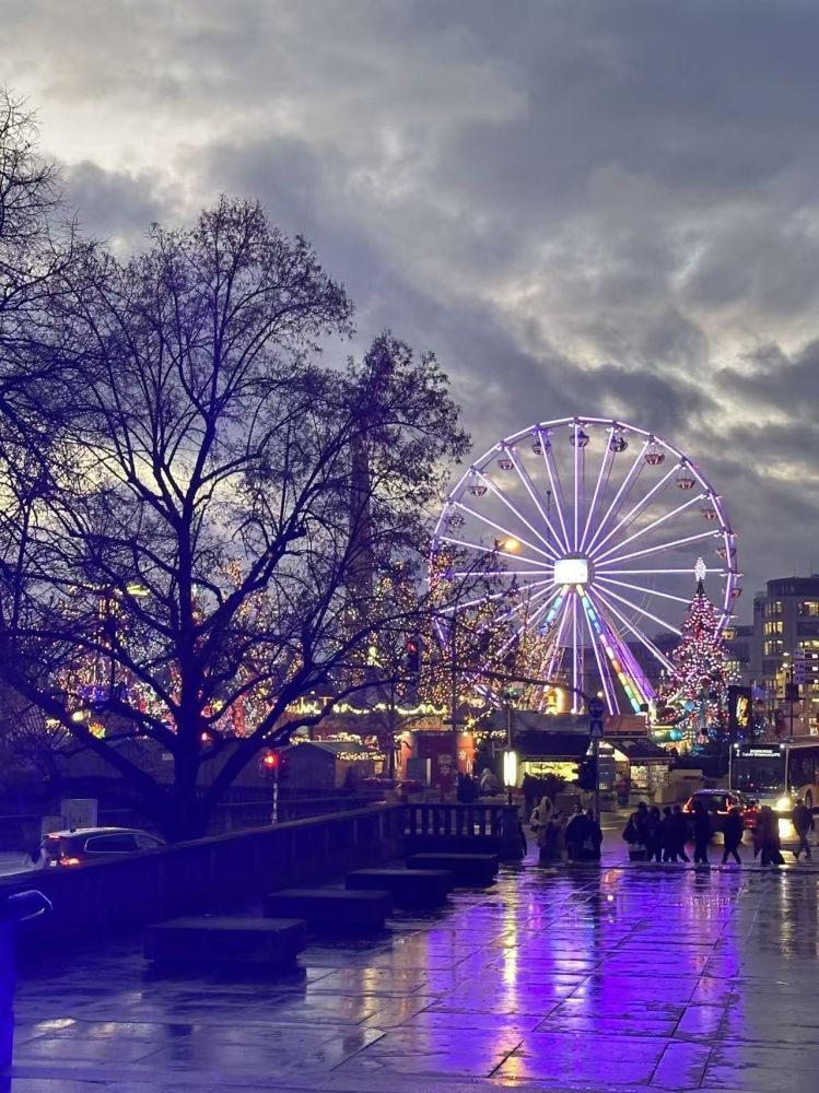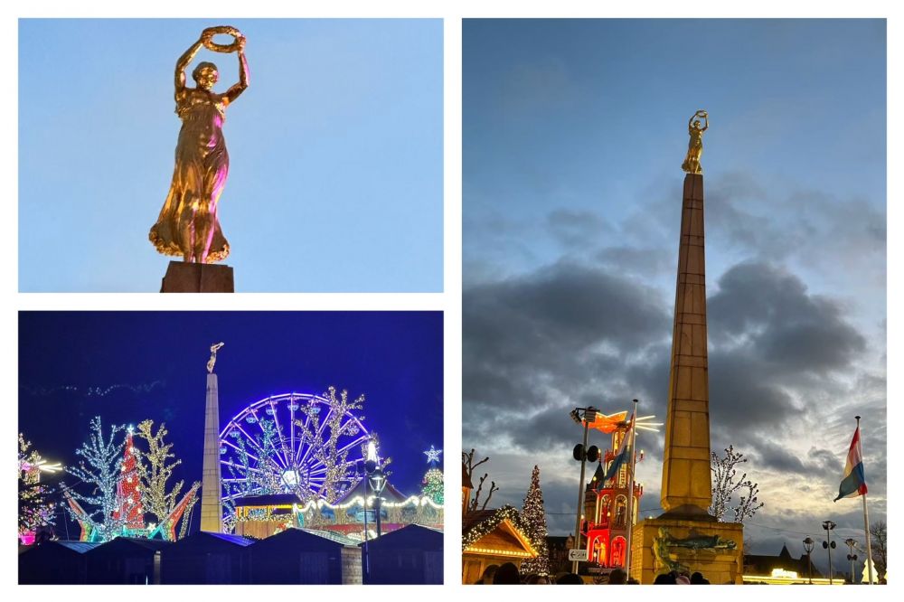 傍晚时分,教堂的钟声悠悠回荡,老城的灯火渐次亮起。我们沿着鹅卵石街道走到老城的核心 -- 宪法广场(Place de la Constitution),象征和平与自由的金色少女雕像(Gëlle Fra)静静屹立其中。广场上的圣诞集市已经热闹起来,空气中弥漫着烤杏仁与热红酒的甜香。高耸的金色少女在灯光映照下闪耀,摩天轮欢快地旋转,脚下的峡谷被灯串点缀得像一条流动的银河。