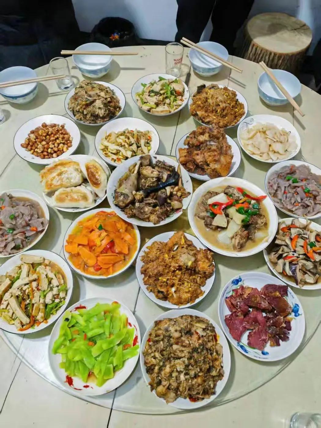 终团聚, 流喜泪。兄弟好, 千杯醉。享豚鸡鱼鸭, 藕菇鲜味。旧岁匆匆今夜尽, 新年福满明晨始。信心高, 再上一杯来, 开年利。