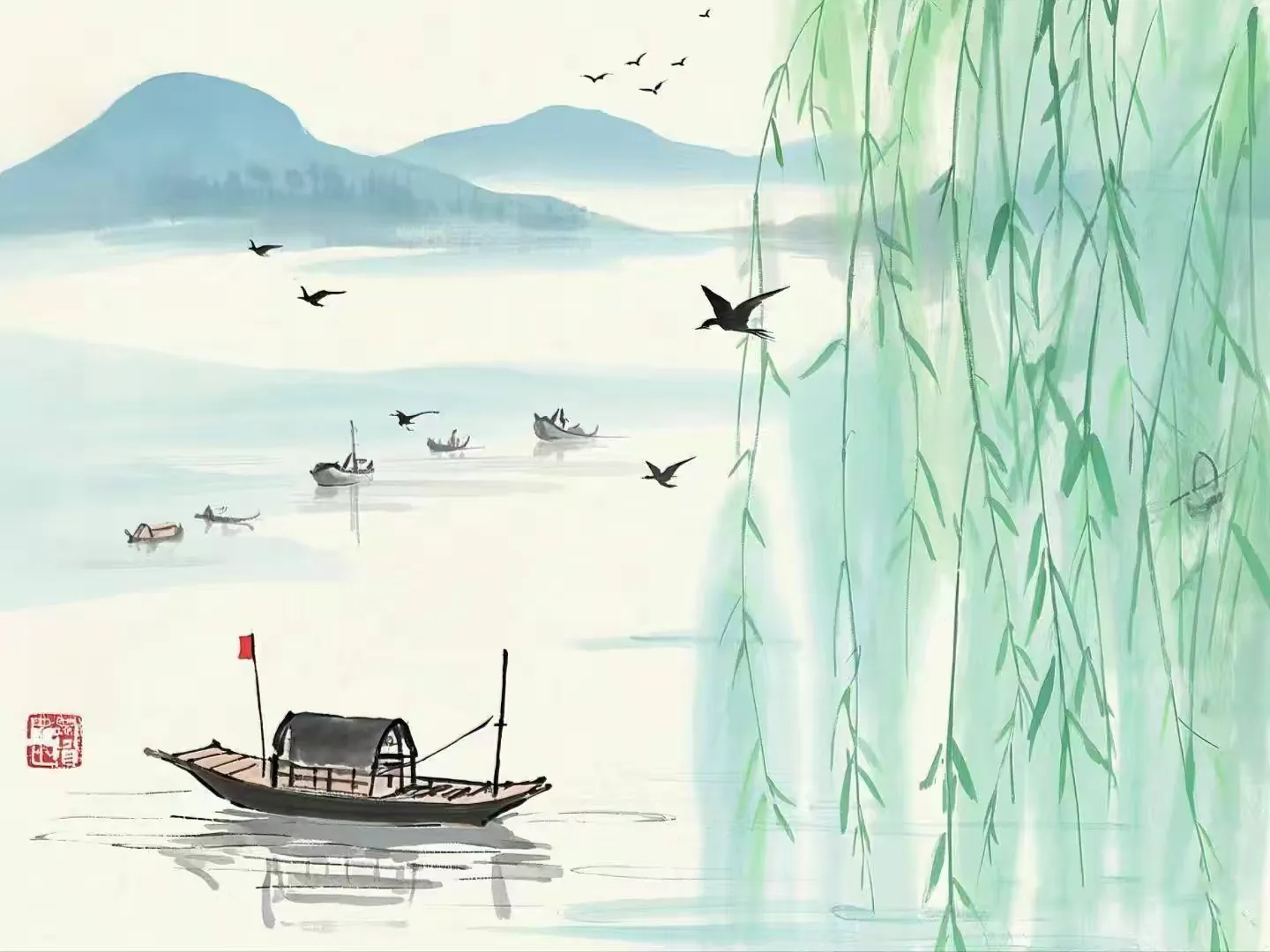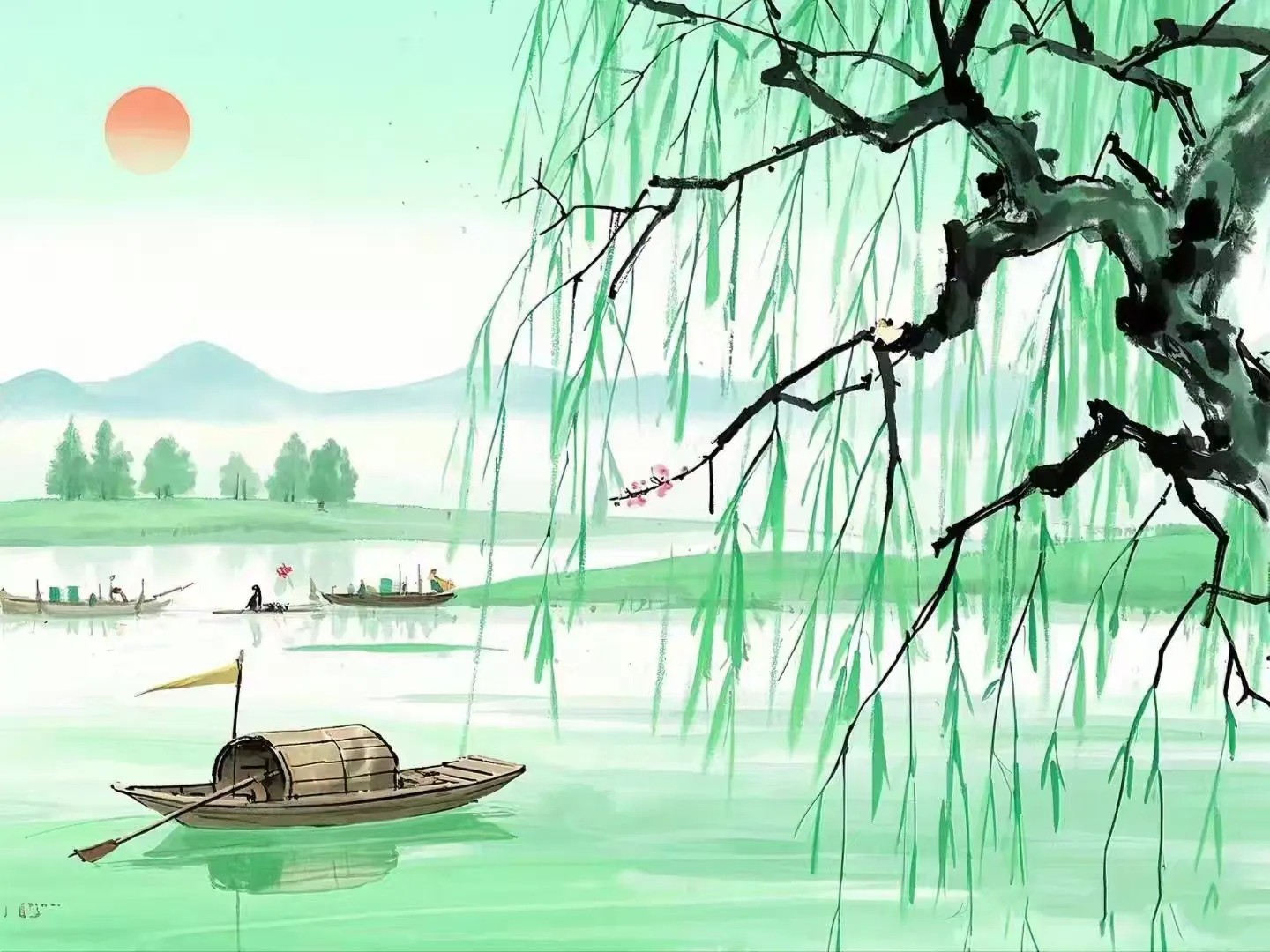 点点清明雨, 远近青山含雾。绿叶渐成荫, 满眼游人无语。