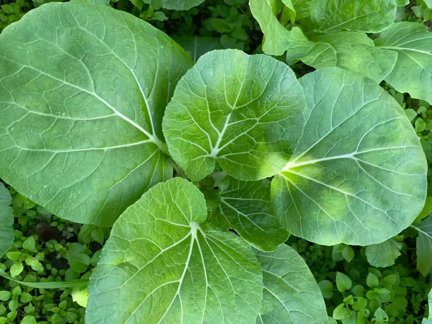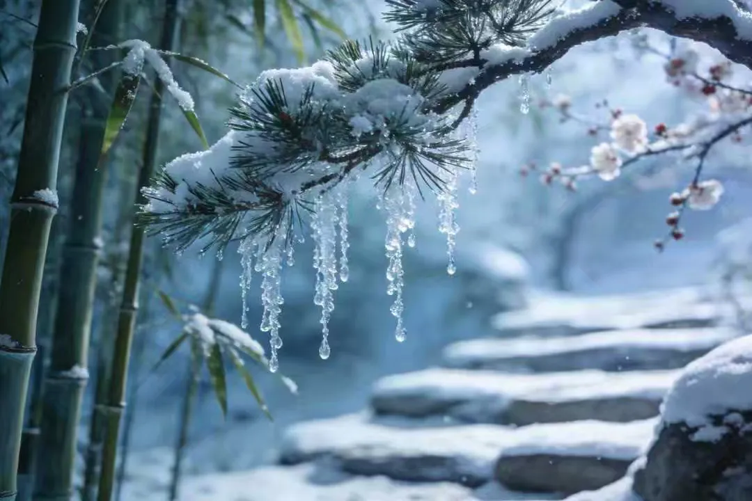 冬至温暖如春天,细雨飘,园中菜妍。漫步处,朦胧雾,雨湿头,房隐树边。