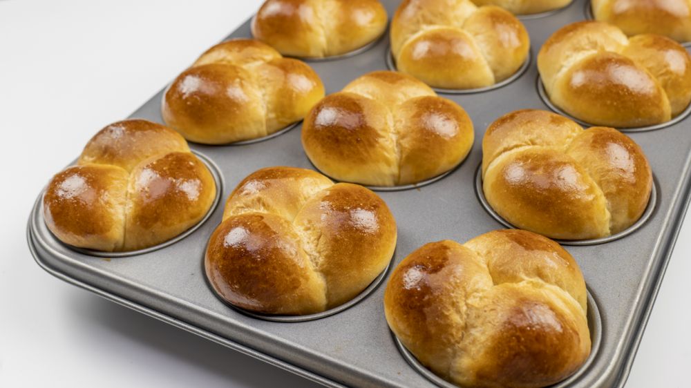 配料:(12连玛芬模具) 300克 面粉 10克 新鲜酵母 (或3克速发干酵母) 3克 盐 50克 炼乳 150毫升 牛奶 1个鸡蛋 30克 黄油