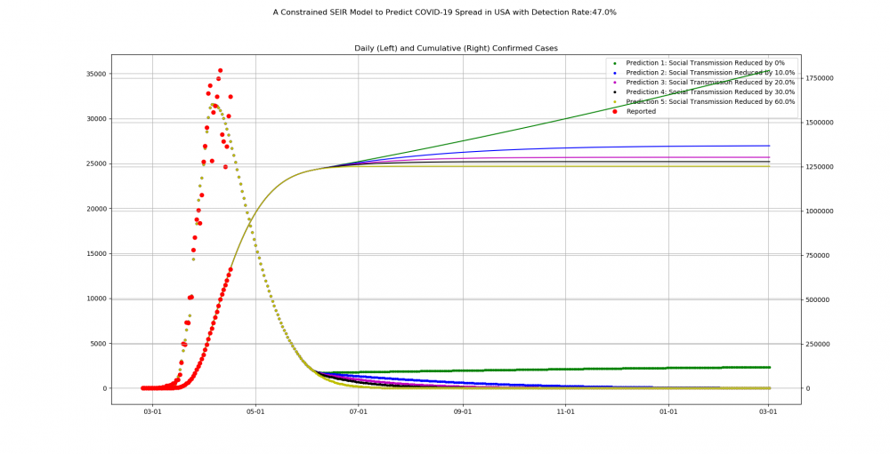 这个模拟问题在于有可能某个地区感染者能被检测到的比例低,比如纽约,那么就需要推迟复工计划,另外保持较高的社交隔离。否则星星之火可以燎原。疫情会重新发展起来。