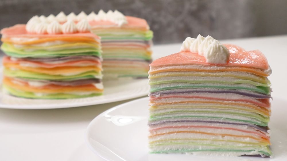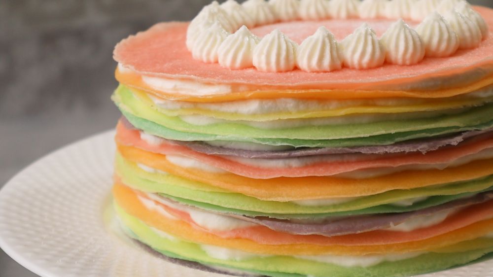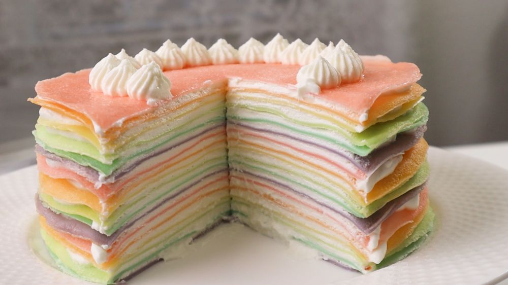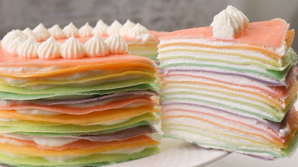 上次做了抹茶千层,很多朋友喜欢,于是我借着娃的要求做了彩虹千层蛋糕。这款蛋糕是集颜值和口感于一身的,非常绚丽,颜值控的老大非常喜欢。这款蛋糕因为需要凸显渐变的颜色,所以饼皮不能太薄,那样颜色的变化就不明显了,所以这次我用的鸡蛋多一些,鸡蛋可以使可丽饼更加的蓬松厚一些。做起来其实不难,就是要把颜色把握好,深浅自己调节,不能做的太深,那样看着太厚重。