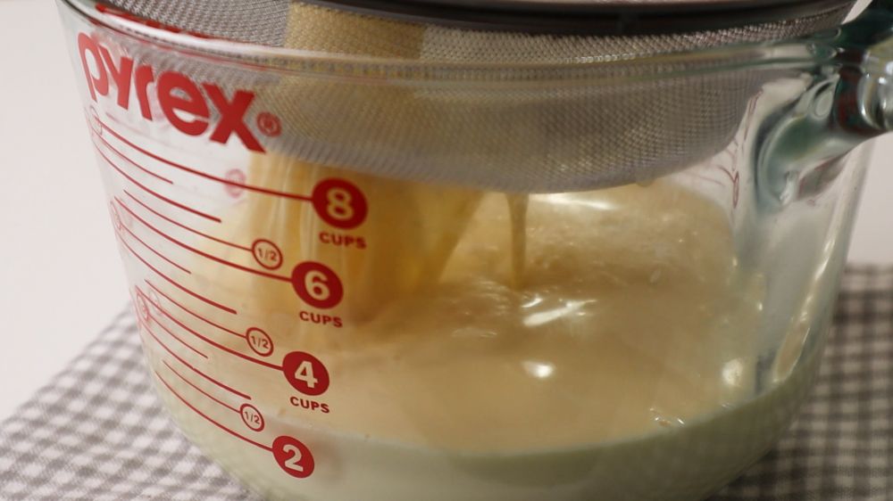 3. 然后把牛奶倒进之前搅拌好的面糊里面,牛奶的温度是30度左右,太热的话就凉凉一点再倒进去,搅拌好之后过滤1-2次,然后放冰箱冷藏1-2个小时,也可以不用冷藏,我比较做现做的可丽饼也一样的好